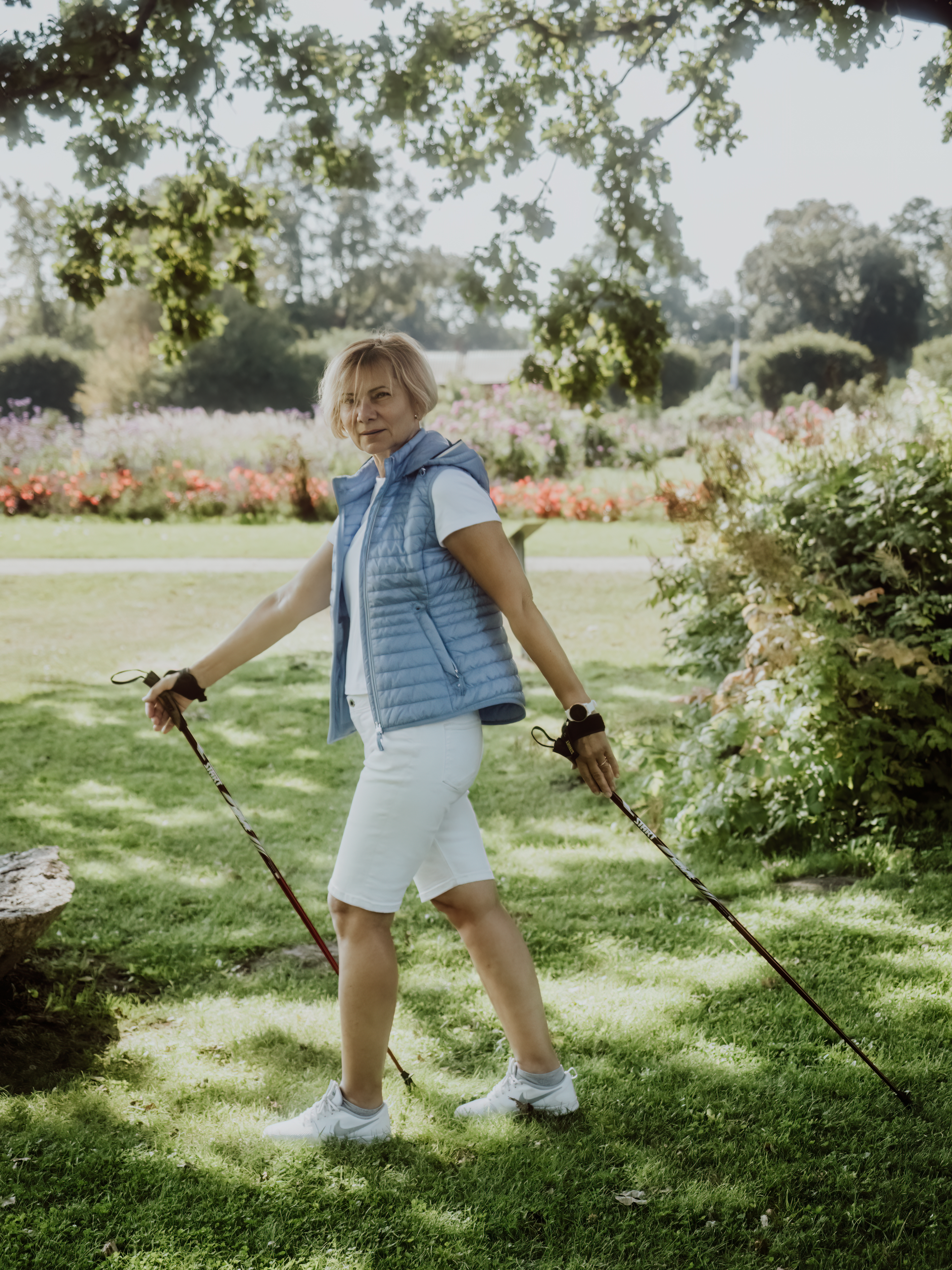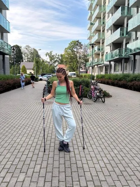 Man vienmēr ir bijis grūti noturēt svaru. Izlasīju Inaras rakstu un sapratu, ka ir jāiemācās pareizi nūjot. Sākot nūjot, biju pārsteigta, cik ātri mainījās pašsajūta – pēc mēneša jutu, ka drēbes kļūst brīvākas, un svari parādīja -4 kilogramus. Viss notika dabīgi – nevis caur diētām, bet caur kustību, kas man patīk un dod enerģiju. Nūjoju regulāri, apmēram 10 000 soļus vienā reizē."